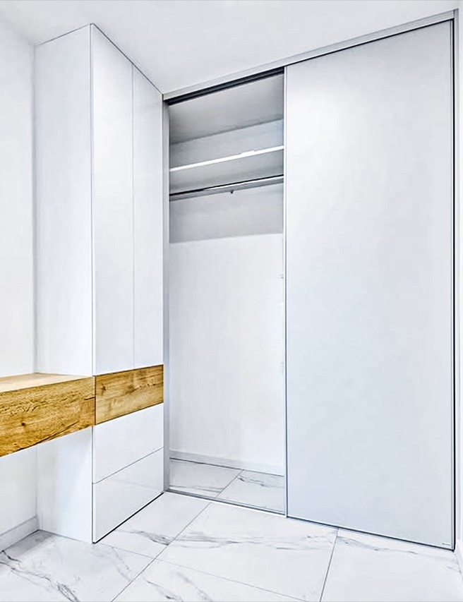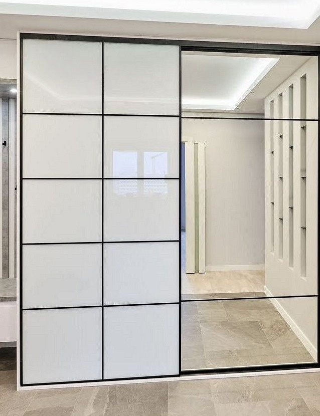 Встроенный шкаф-купе с комбинированными дверями из белого стекла «Модель 635»