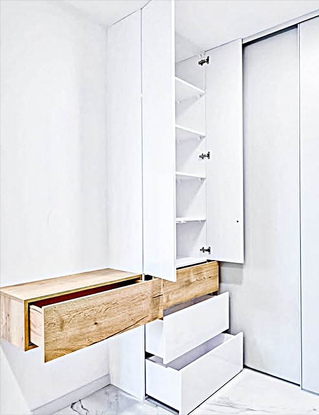 Белый встроенный шкаф купе в прихожую с угловым пеналом и консолью «Модель 703»