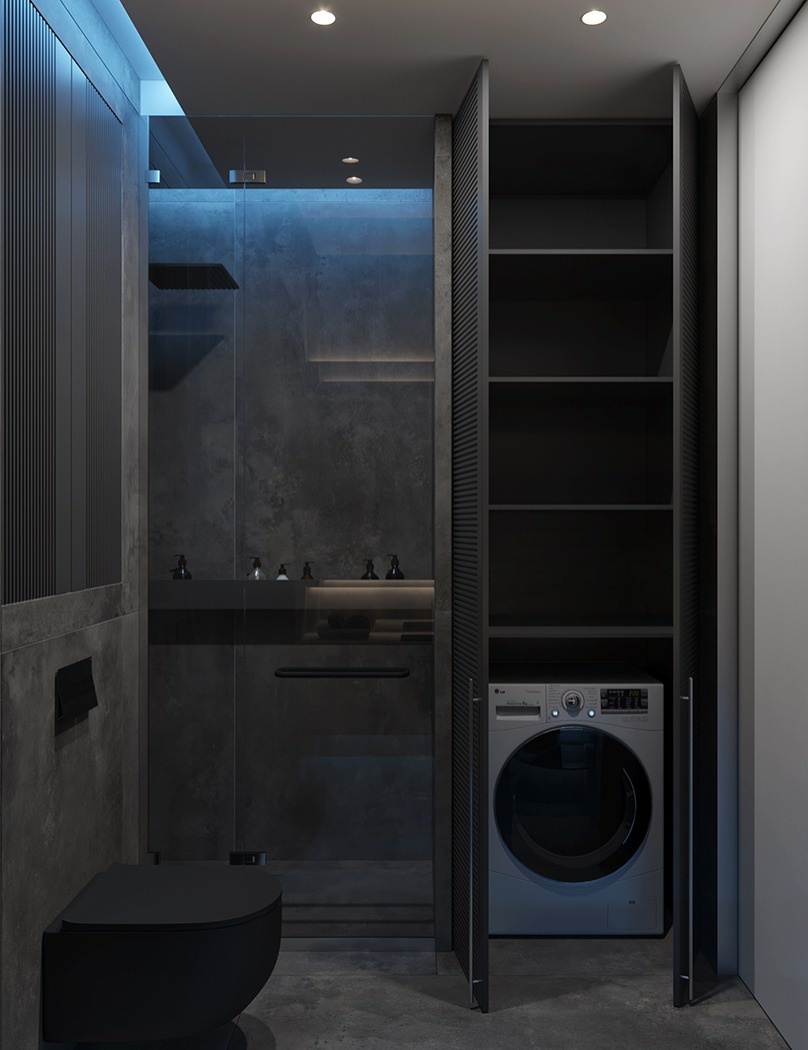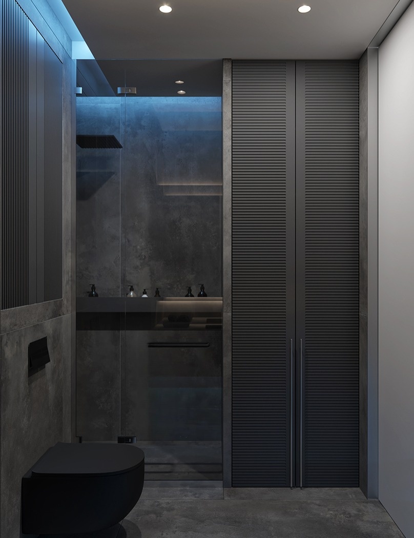 Высокий шкаф серого цвета с фрезерованными дверями в санузел «Модель 1033»