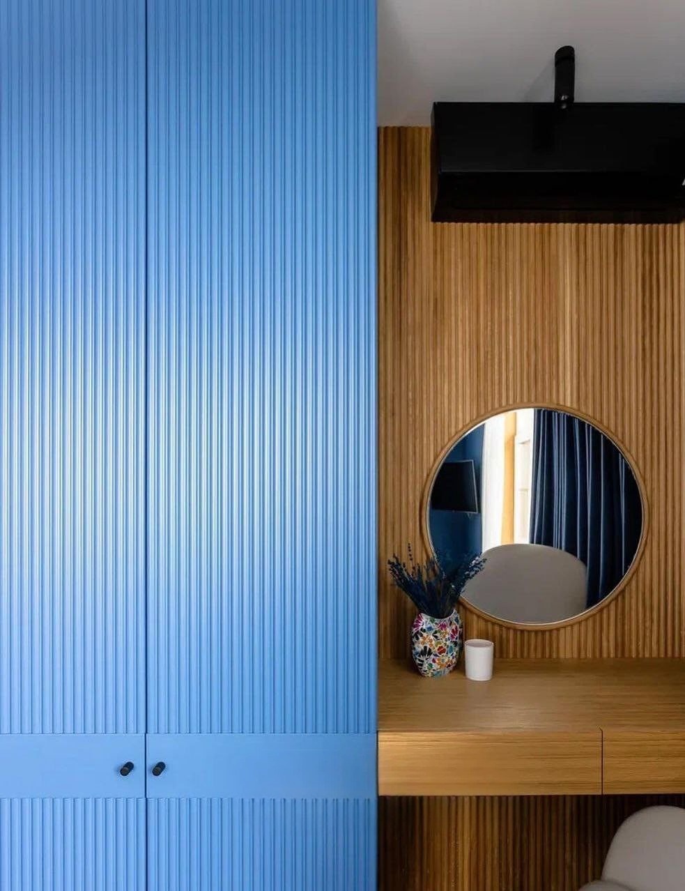 Встроенный в нишу голубой шкаф с фрезерованными дверями «Модель 1300»