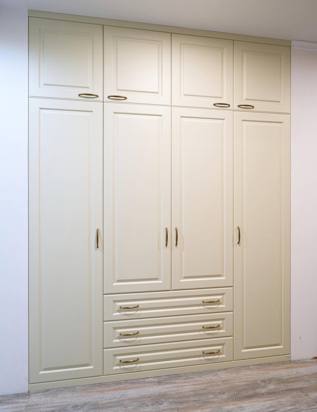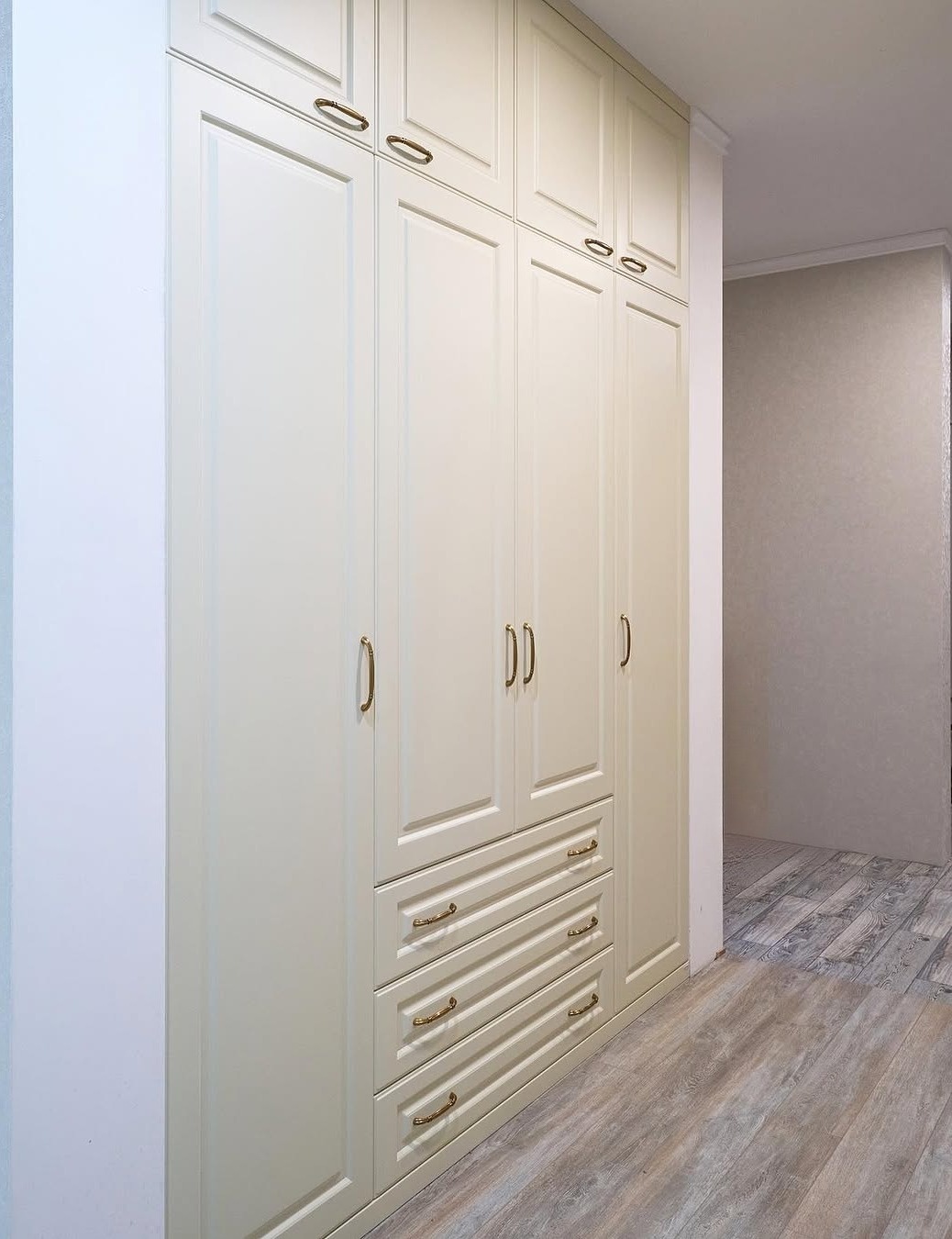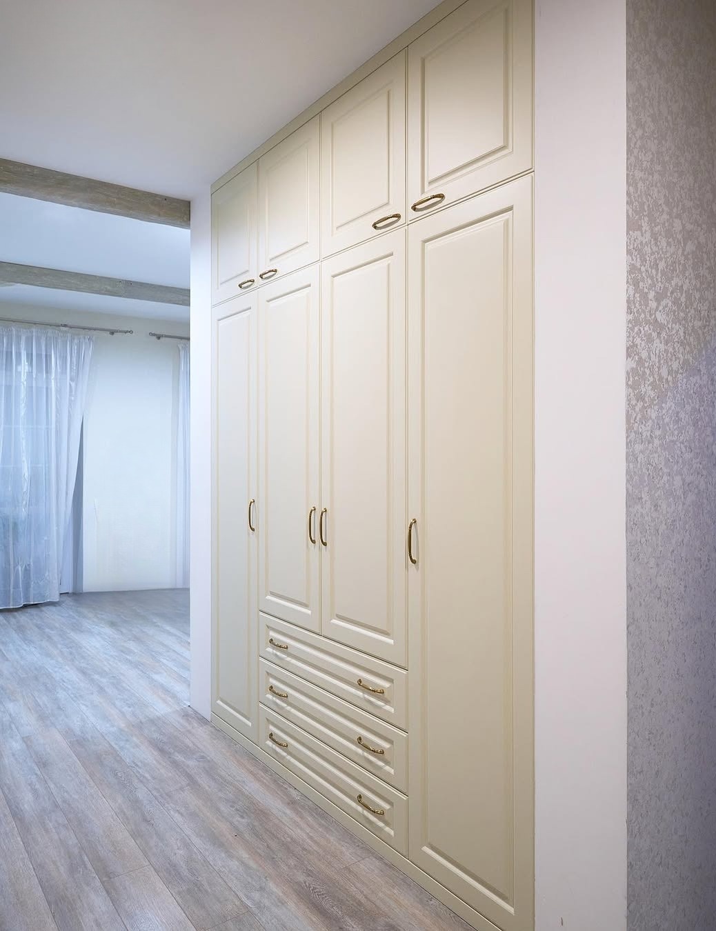 Встраиваемый во всю стену белый классический шкаф в спальню «Модель 1328»