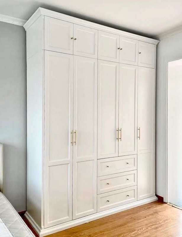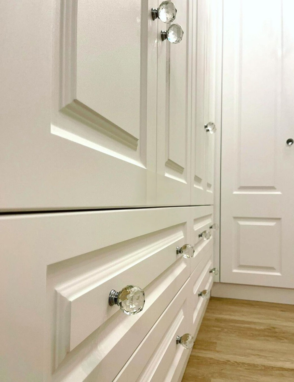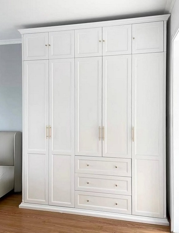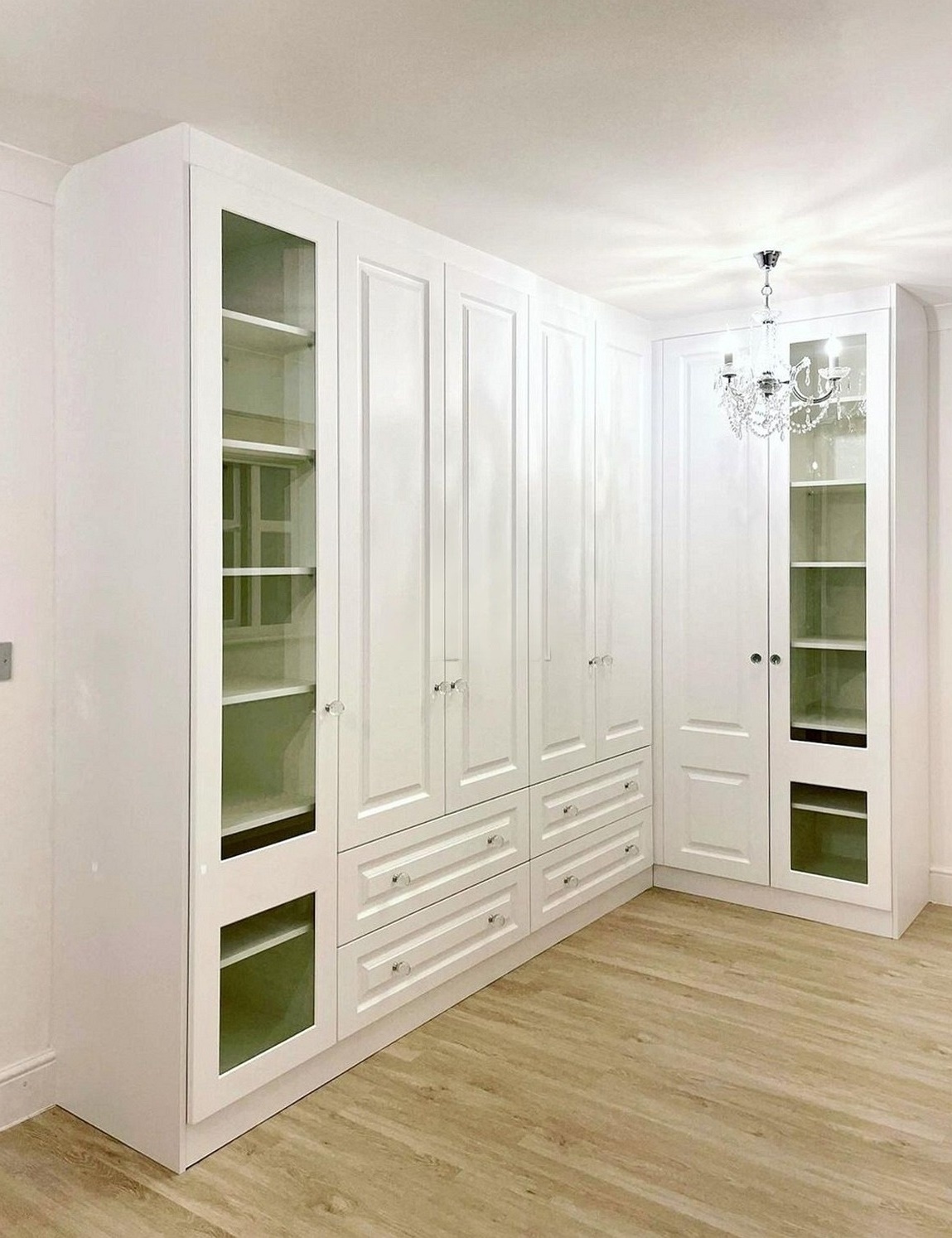 Встраиваемый во всю стену белый классический шкаф в спальню «Модель 1328»