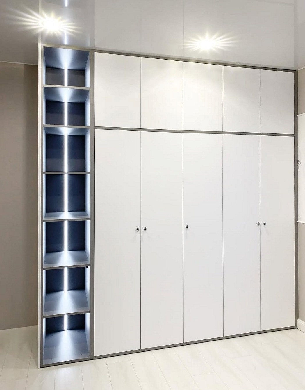Пятидверный белый шкаф со стеллажом и подсветкой «Модель 460»
