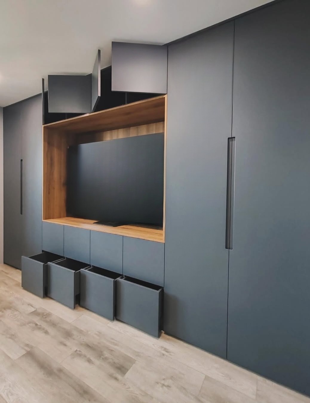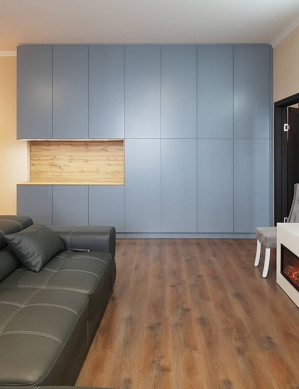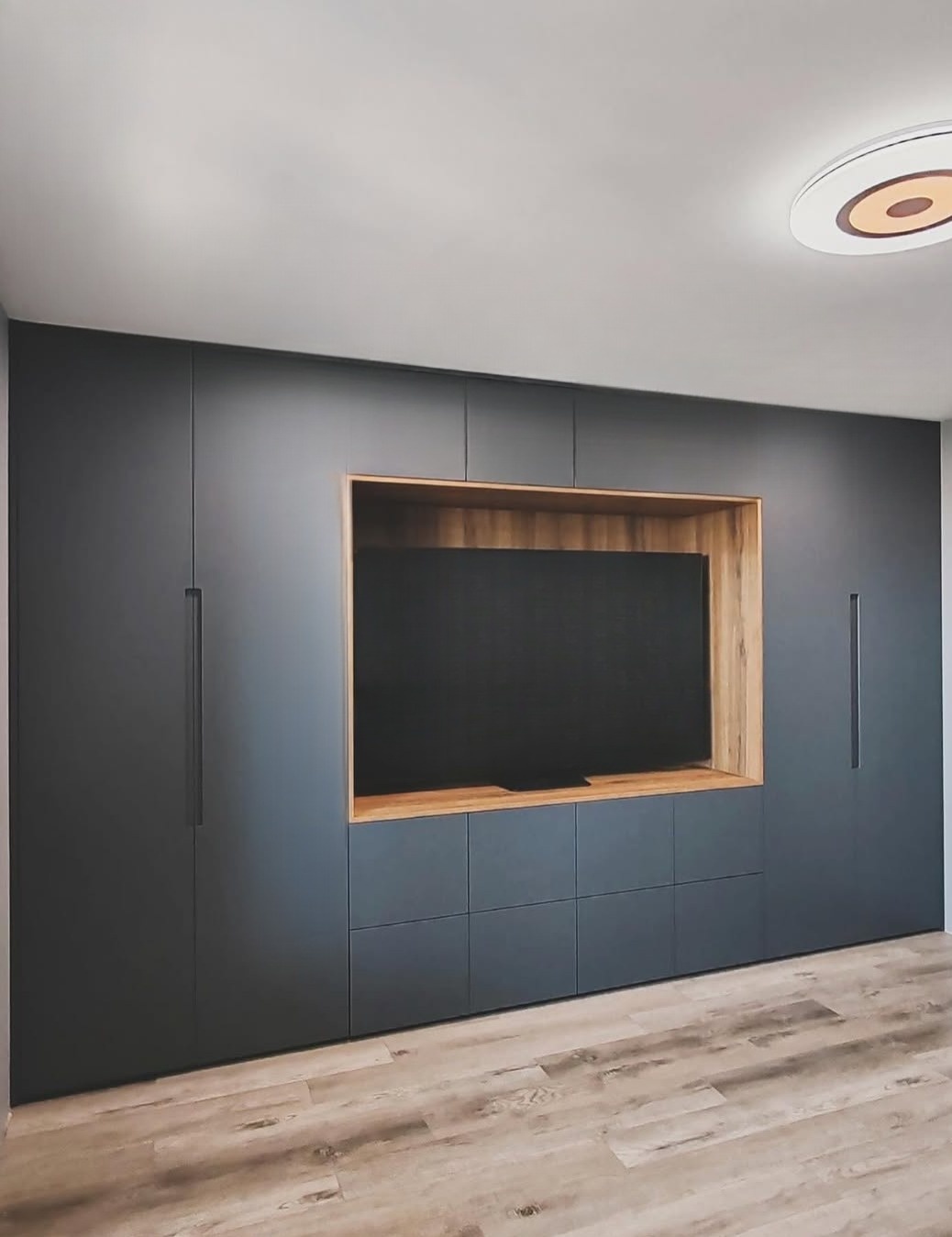 Серый шкаф во всю стену с нишей под тв «Модель 155»