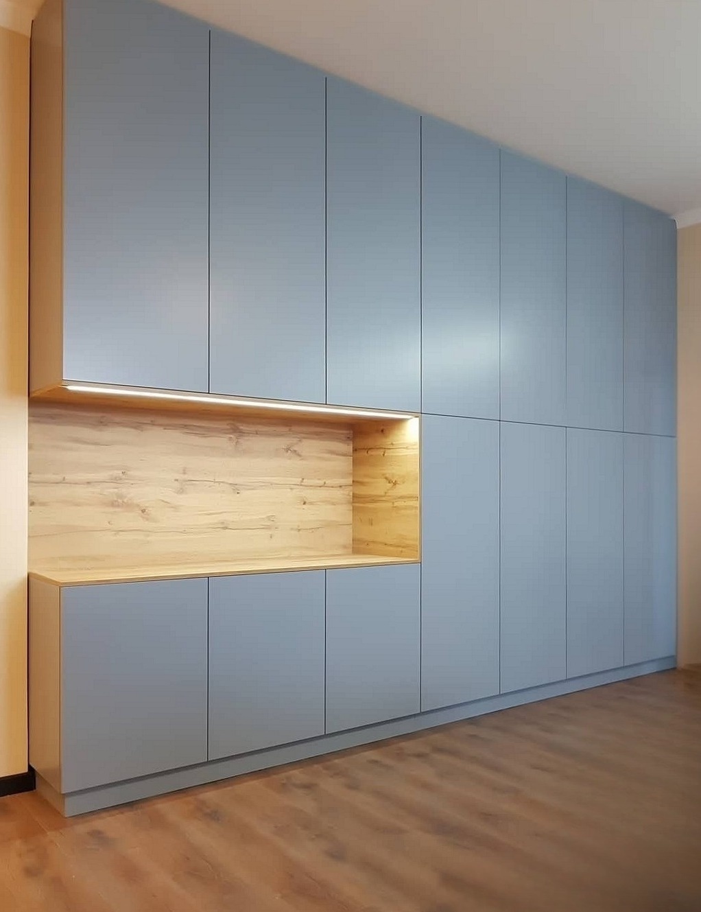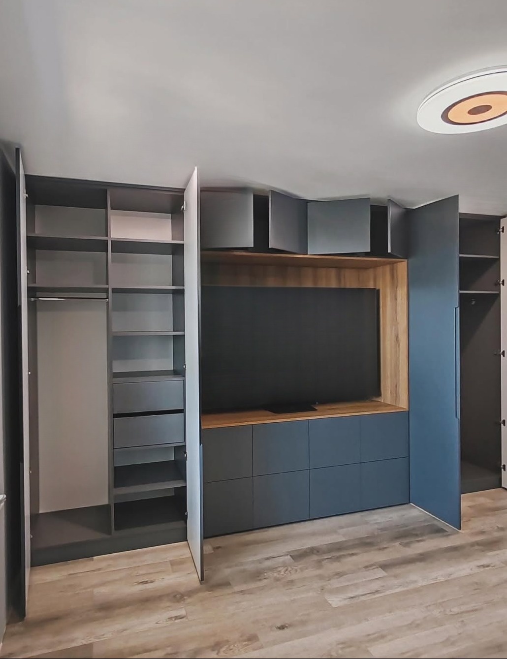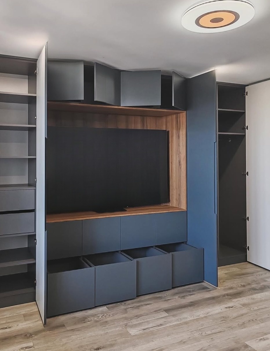 Серый шкаф во всю стену с нишей под тв «Модель 155»