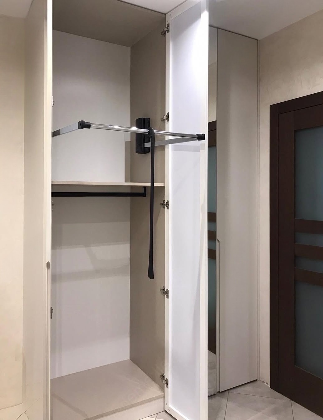 Встроенная белая прихожая с выдвижной штангой «Модель 563»
