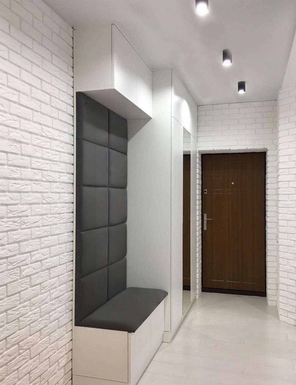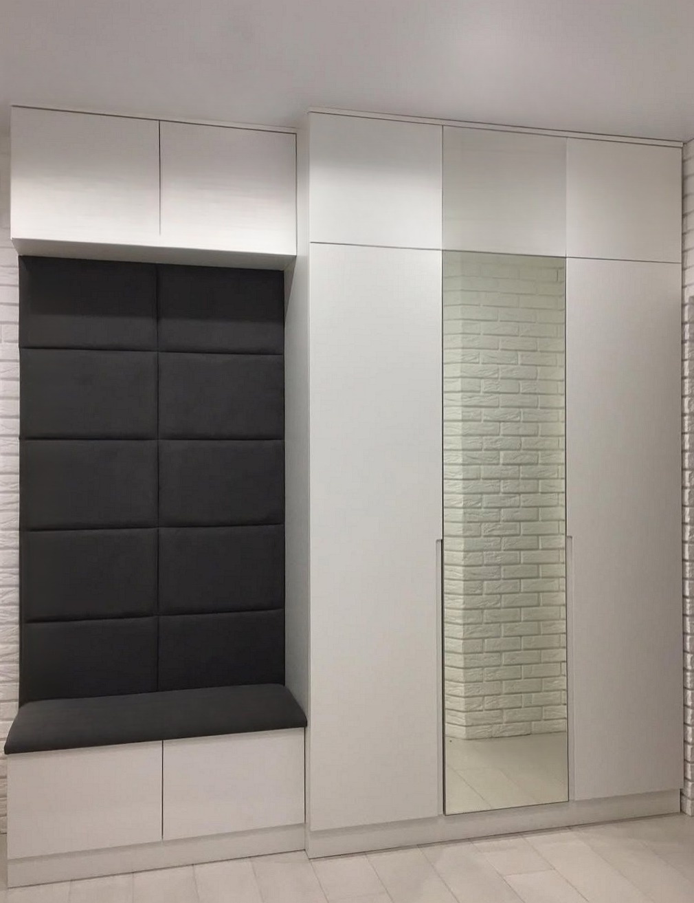 Встроенная белая прихожая с мягкой нишей и антресолью «Модель 587»