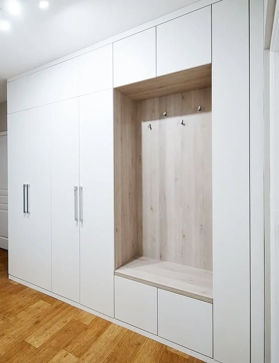 Сегодня это встроенные в интерьер шкафы в минималистичном дизайне. Однотонные фасады в пастельные тонах и с аккуратными ручками.