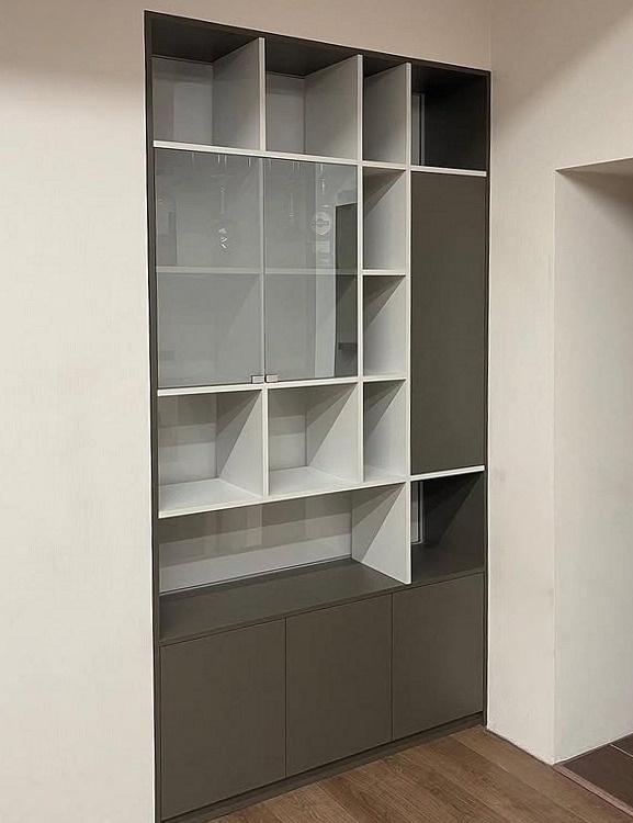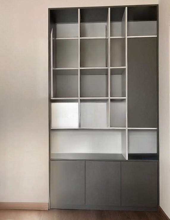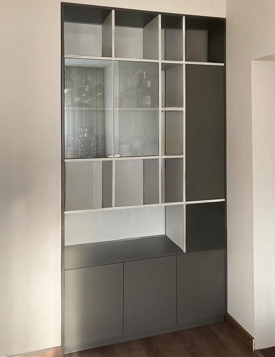 Серый распашной шкаф с открытыми полками посередине «Модель 665»