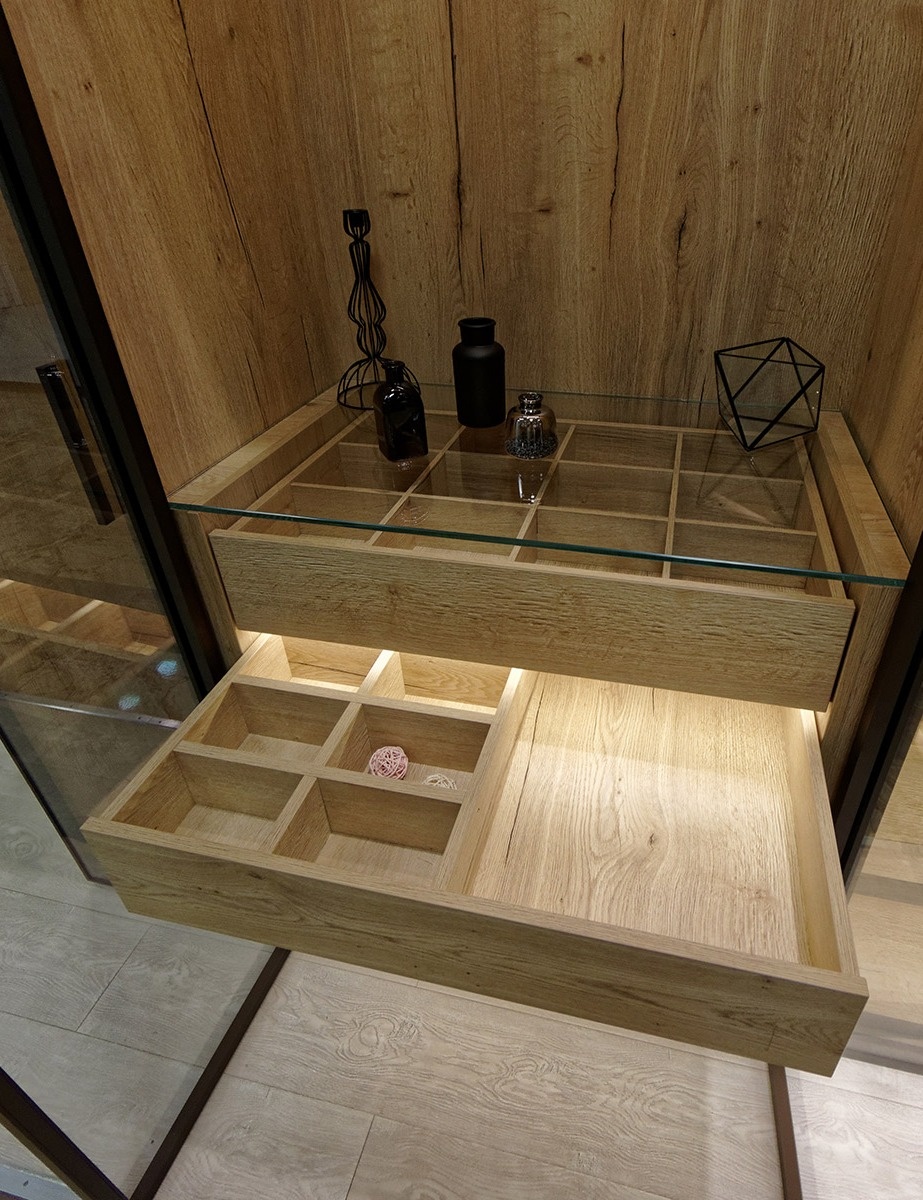 Распашной шкаф цвета дуб с подсветкой и стеклянными дверями «Модель 1153»