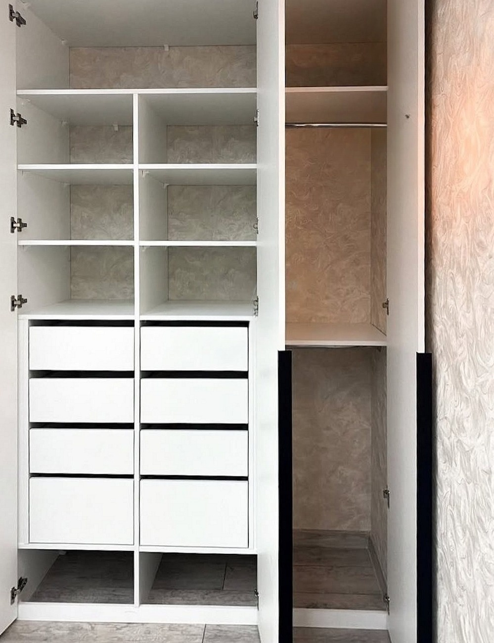 Встроенный шкаф цвета бетон с открытыми полками «Модель 421»